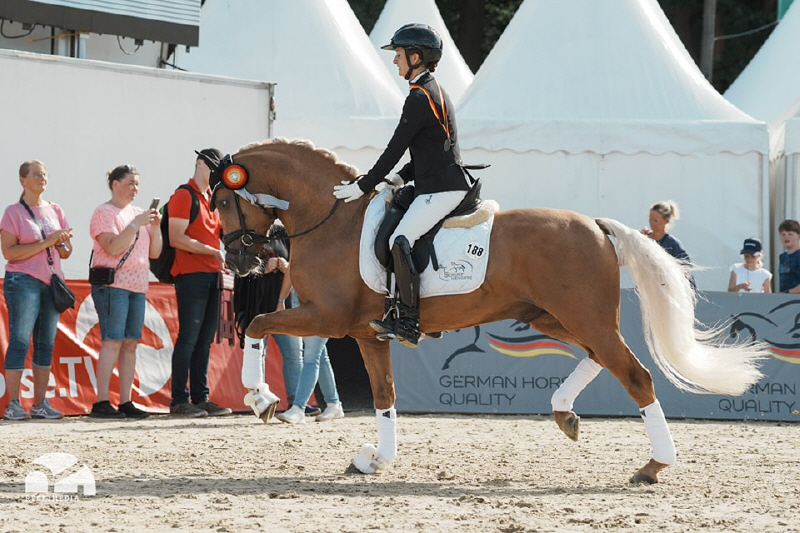 Auch unter dem Reiter bestätigte Der Goldjunge AT NRW seine Qualität eindrucksvoll. Bereits dreijährig gewann er die Sichtungsprüfung zu den Bundeschampionaten mit der Wertnote 8,5. Die Finalqualifikation konnte er mit der herausragenden Wertnote 9,0 für sich entscheiden. Mit der Endnote 8,8 erreichte er im Finale einen ausgezeichneten zweiten Platz und sicherte sich damit den Titel des Vize-Bundeschampions der dreijährigen Reitponyhengste 2024.Im vergangenen Jahr belegte er bei den Bundeschampionaten sowohl in der Einlaufprüfung als auch im Finale jeweils Rang drei und gewann damit die Bronzemedaille der vierjährigen Reitponyhengste.